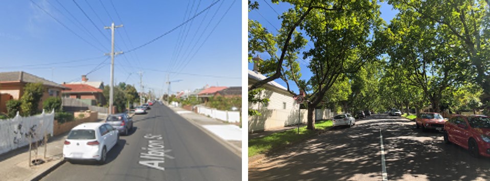 The street on the left runs east to west and is exposed to the sun more throughout the day compared to a street that runs north to south. These streets should be prioritised for planting trees to shade.