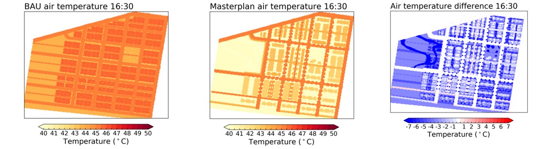 Figure 2. Modelling of air temperature comparing business as usual (BAU) with a master planned development that incorporates features of urban cooling