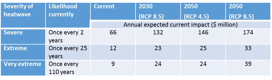 Given the current likelihood of each type of heatwave occurring (see Table 1), the total average annual expected economic cost of heatwaves to Victoria is estimated to be about $90 million. However, this assumes current climate and economic conditions.