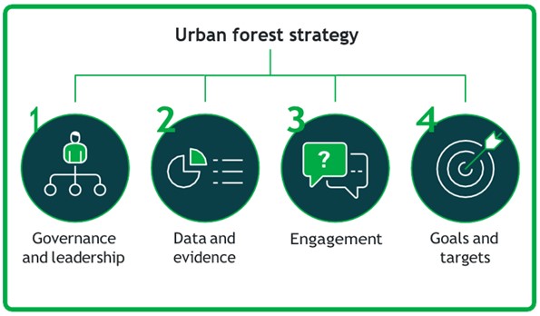 Figure 3 Essential elements of an urban forest strategy from the Greener Neighbourhoods Guide (DPIE, 2021), a document created by TreeIQ and Mosaic Insights for the NSW State Government’s then Department of Planning, Industry and Environment