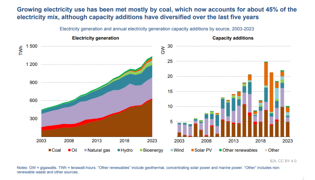 Figure 1 shows that the growing electricity use has been met mostly by coal, which now accounts for about 45% of the electricity mix, although capacity additions have diversified over the last five years show the evolution of electricity generation and capacity additions by source in ASEAN from 2003 to 2023. Notably, solar PV and wind have seen significant increases since 2018, indicating a shift not only in fuel source but also in the way electricity is generated.