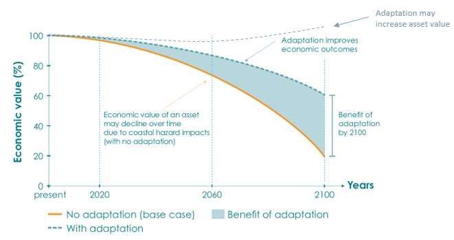 The base case was determined by examining the likelihood and consequence (i.e. dollar damage) of coastal hazard impacts on assets across the region and over different timeframes (e.g. present day, 2060, 2100). A cost-benefit analysis approach was then undertaken to determine which adaptation option (or combination of options) provide the greatest benefit relative to cost.